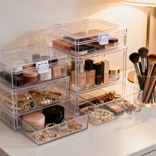 Kauneus ja ihonhoito: PC:n läpinäkyvää säilytyslaatikkoa käytetään huulipunan, luomivärien ja meikkisiveltimen sijoittamiseen. Se voidaan suunnitella monikerroksisella laatikkorakenteella. Yläkerrosta käytetään tavallisten tarvikkeiden sijoittamiseen ja alakerrosta tavaroiden varastointiin; Pienellä väliseinällä varustettua säilytyslaatikkoa käytetään pitkien ja ohuiden esineiden, kuten silmämustan ja eyeliner-kynän, lajitteluun sotkujen välttämiseksi.