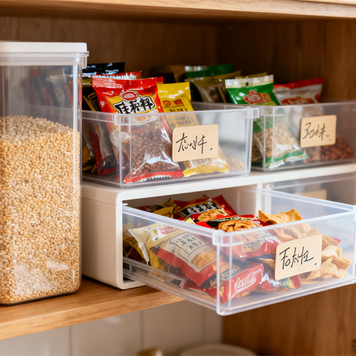 Keittiön säilytys: Elintarvikelaatuista läpinäkyvää PP-säilytyslaatikkoa käytetään jyvien, kuiva-aineiden ja välipalojen säilyttämiseen. Säilytyslaatikko on tiivis, joka on kosteuden- ja hyönteissuojattu. Se on läpinäkyvä ja näkyvä, joten se on helppo löytää nopeasti; Läpinäkyvä PET-tuorelaatikko sopii jääkaapin jäähdytykseen, estää hajuja ja voidaan lämmittää mikroaaltouunissa.
