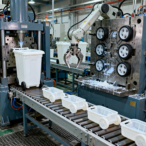 Injection Wheelie Bin Molding viittaa suuren kapasiteetin roskasäiliöön, joka on valmistettu valmistamalla ydinrakenteita, kuten roskakorien runkoja ja kansia, laajamittaisella muoviruiskuvaluprosessilla ja koomalla ne sitten lisävarusteilla, kuten teloilla ja kahvoilla. Sen ydinominaisuus on yksiosaisen ruiskupuristuksen käyttäminen saumattoman säiliön rungon aikaansaamiseksi (tilavuus yleensä 120L-240L, jotkut teollisuusastiat jopa 1000L). Verrattuna perinteisiin metalliastioihin (helppo ruostumaan) tai käsin liitettäviin muoviastioihin (huono tiiviys), sillä on vahva säänkestävyys, iskunkestävyys, vuotojen esto ja helppo puhdistaa. Sitä käytetään laajalti kaupunkien kaduilla, yhteisöissä, kouluissa, tehtaissa ja muissa skenaarioissa mukautuen koneistettuun jätteenkeräykseen ja -kuljetukseen (voi toimia yhteistyössä roskien puristusautojen kanssa automaattista tyhjennystä varten).