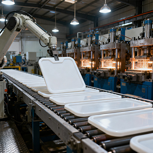 Raaka-aine on pääosin HDPE, ja modifioivia aineita lisätään toiminnallisten vaatimusten mukaan: UV-suoja-aine (0,5% -1%, säänkestävyyttä parantava aine), hapettumisenestoaine (0,2% -0,5%, ikääntymistä viivästävä), värin perusseos (2% -3%, yleensä vihreä, sininen, harmaa, täyttää yhdyskuntajätteen luokituksen väristandardin). Raaka-aineen valmistuksen aikana HDPE-hiukkaset sekoitetaan lisäaineisiin ja laitetaan suureen kuivausrumpuun (kapasiteetti 1000-2000kg, lämpötila 80-100℃, aika 4-6 tuntia) kosteuden poistamiseksi kokonaan (välten kuplia ja kutistumisonteloita ruiskupuristuksen jälkeen). Ruiskuvalu vaatii suuren vaakasuuntaisen ruiskuvalukoneen (puristusvoima 1600-3000 tonnia, ruiskutustilavuus 5000-10000g), ja prosessiparametrit on asetettu: tynnyrin lämpötila 160-200 ℃ (etuosa 160-180 ℃, keskiosa 180-190 ℃ ruiskutuspaine 0190 ℃) 80-120MPa, pitopaine 60-80MPa, pitoaika 20-30s, jäähdytysaika 30-60s (säädetty roskakorin paksuuden mukaan). Ruiskutuksen aikana sulaa HDPE:tä ruiskutetaan tasaisesti muottipesään kuumakanavan kautta. Jäähdytyksen ja kovettamisen jälkeen säiliön rungon aihio puretaan muotista suurella poistomekanismilla (ejektoriholkin + poistolevyn yhdistelmä), ja pieni määrä portin jäännöksiä poistetaan manuaalisesti muotista irrottamisen jälkeen (kuumakanavarakenne voi vähentää jäämiä merkittävästi).